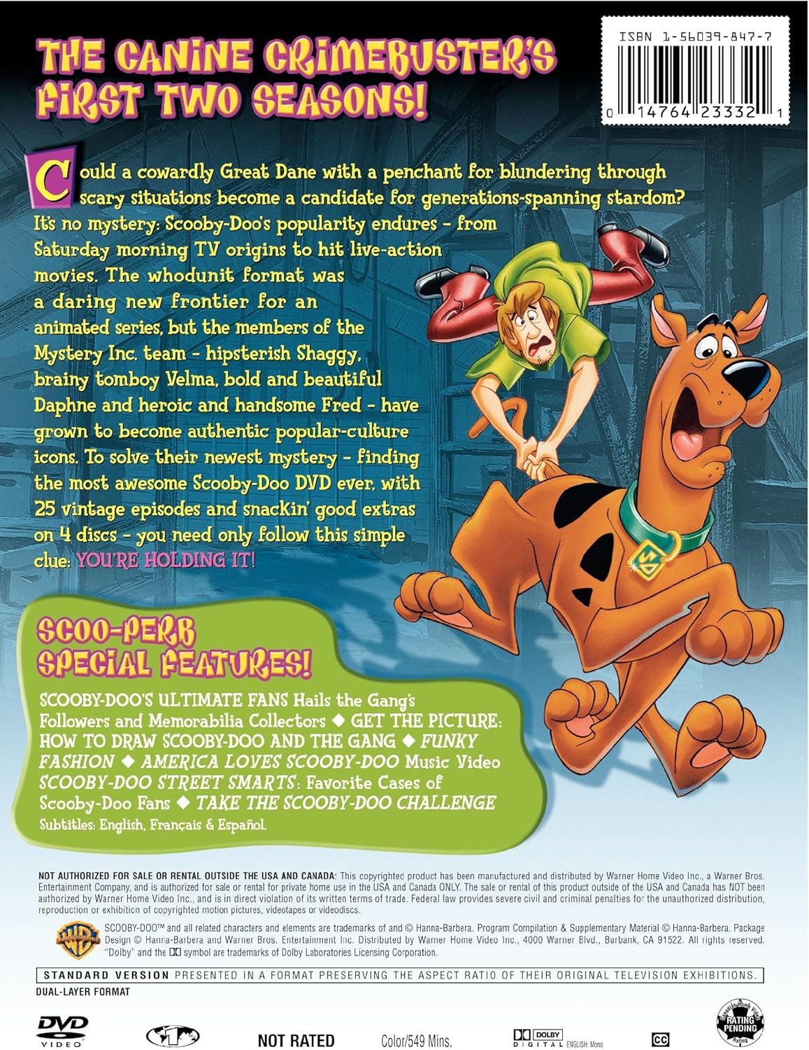 Scooby-Doo Where Are You! 1st and 2nd seasons (1969-1970) feature 25 classic, remastered episodes in a 3-4 disc DVD set. The collection includes iconic mysteries with Scooby, Shaggy, Fred, Daphne, and Velma, featuring the original theme song and infamous, spooky, yet comedic, 1970s, easy-listening tunes. With 25 Episodes and 3 Discs, this boxset is sure to keep you occupied and fulfil your need for mystery!