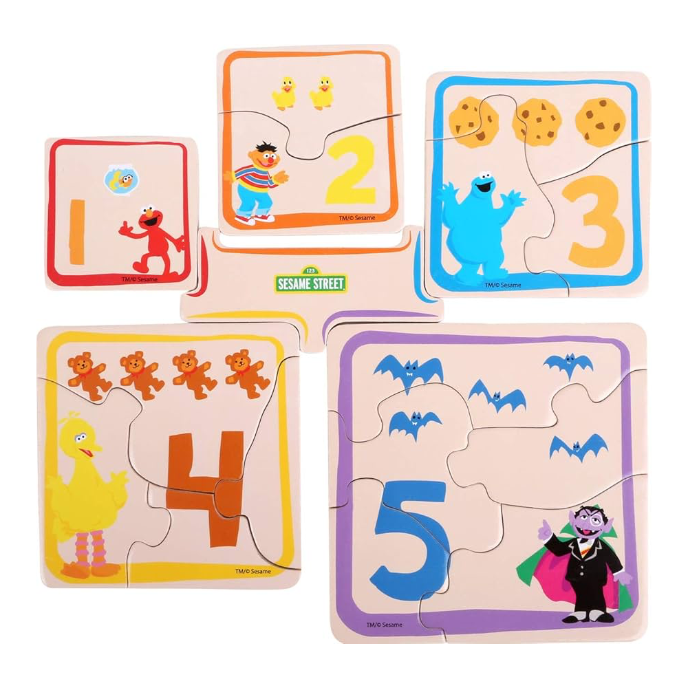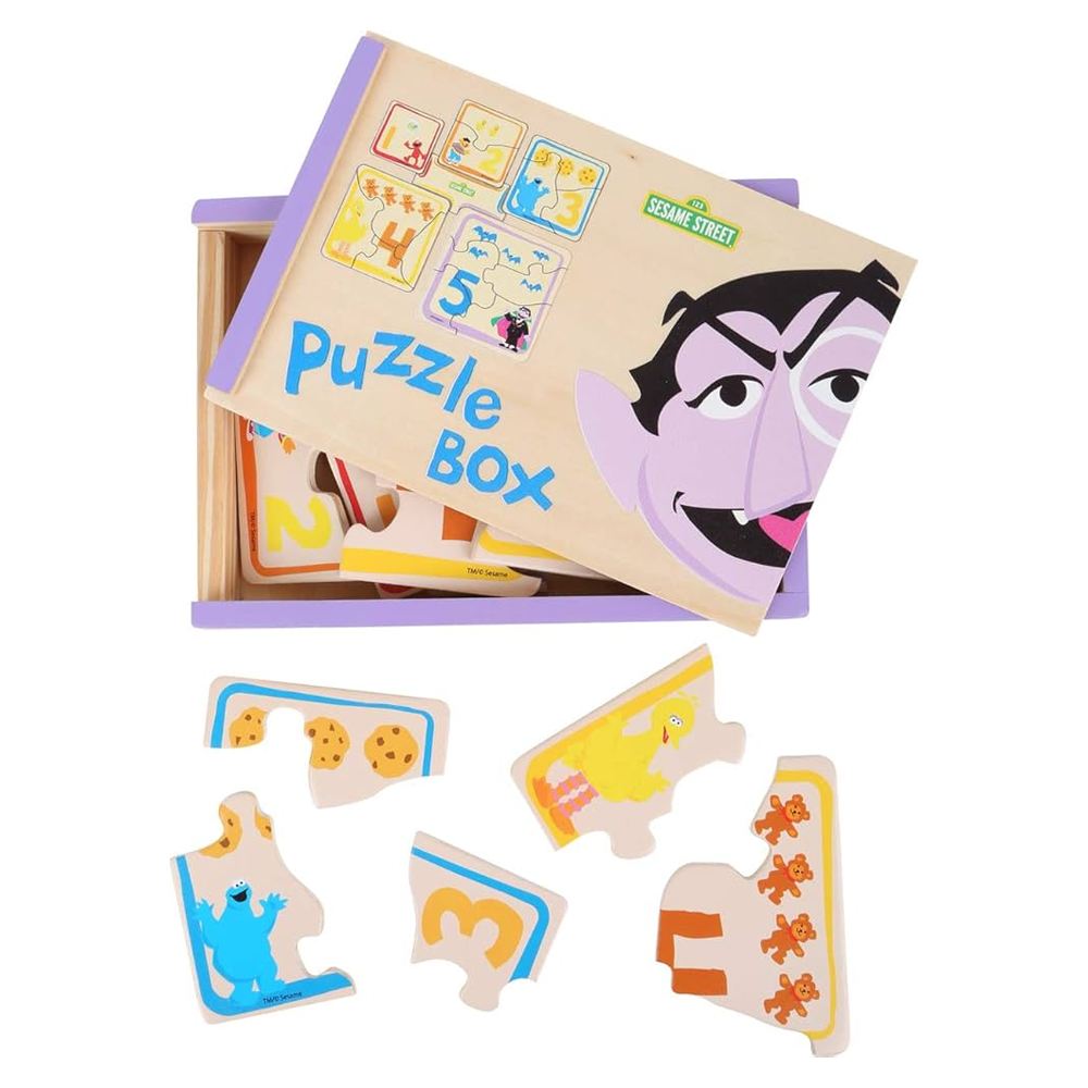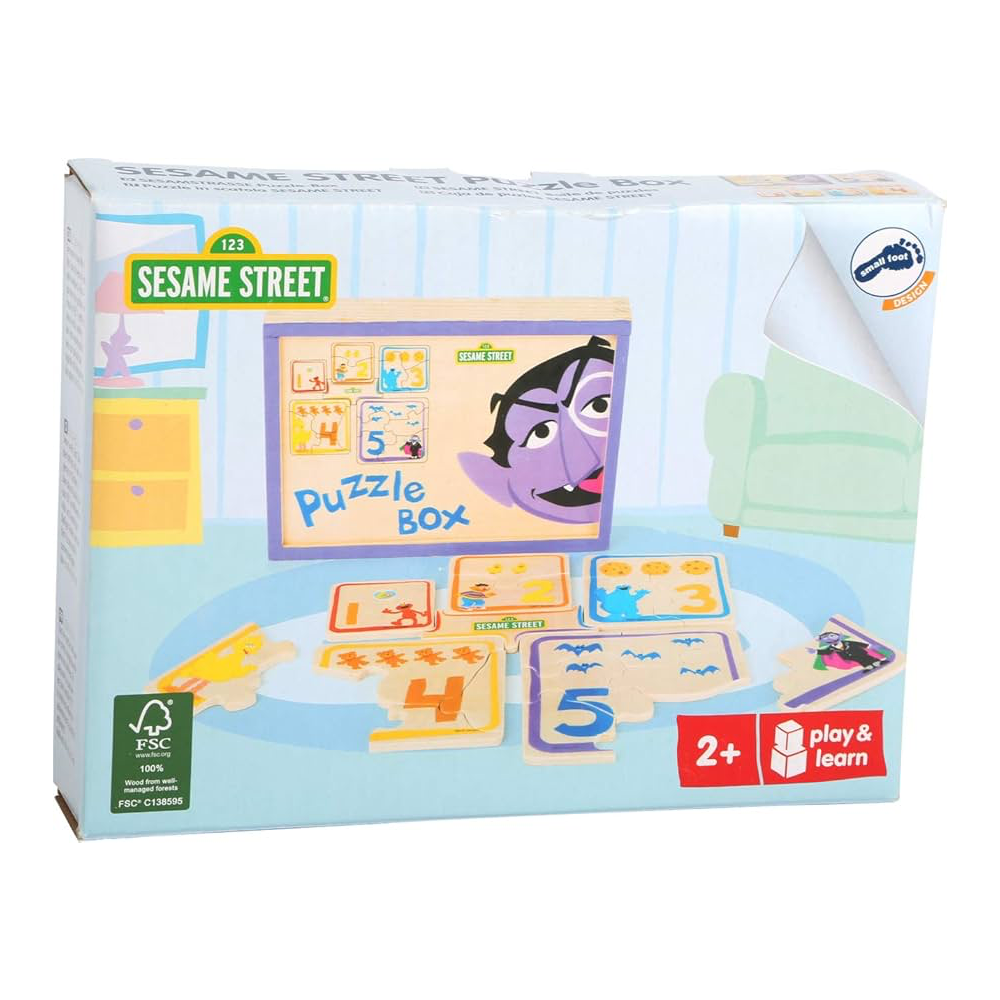 1, 2, 3, 4, 5...! Everybody knows that The Count loves to busy himself with numbers all the time. He is featured on this puzzle box made of FSC®-certified wood, and he´s waiting for hard-working children who will quickly put all five puzzles together. Whether it's the Cookie Monster, Elmo, Ernie, Big Bird or The Count - there's a suitable favorite motif for every SESAME STREET lover! The individual puzzles comes in different sizes, and can be easily differentiated via their colors. The middle piece with the Sesame Street logo allows all five puzzles can be combined together to make one big puzzle with 16 pieces. The convenient puzzle box with the sliding lid is ready to be transported. Lots of puzzling fun for all!
